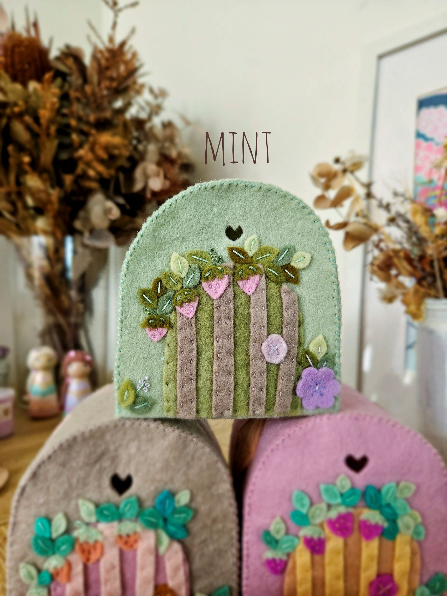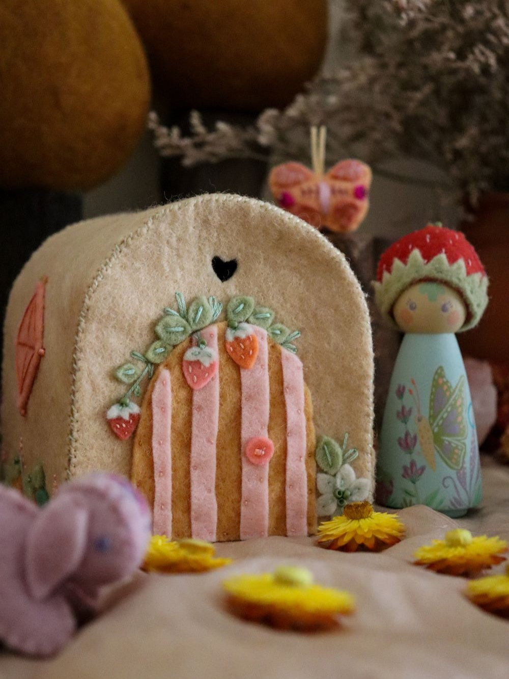 Designed and lovingly handmade by me! These cottages can also be accompanied by our Strawberry Sprite Mini Folk, or any of the other items from our Strawberry Fields Collection.