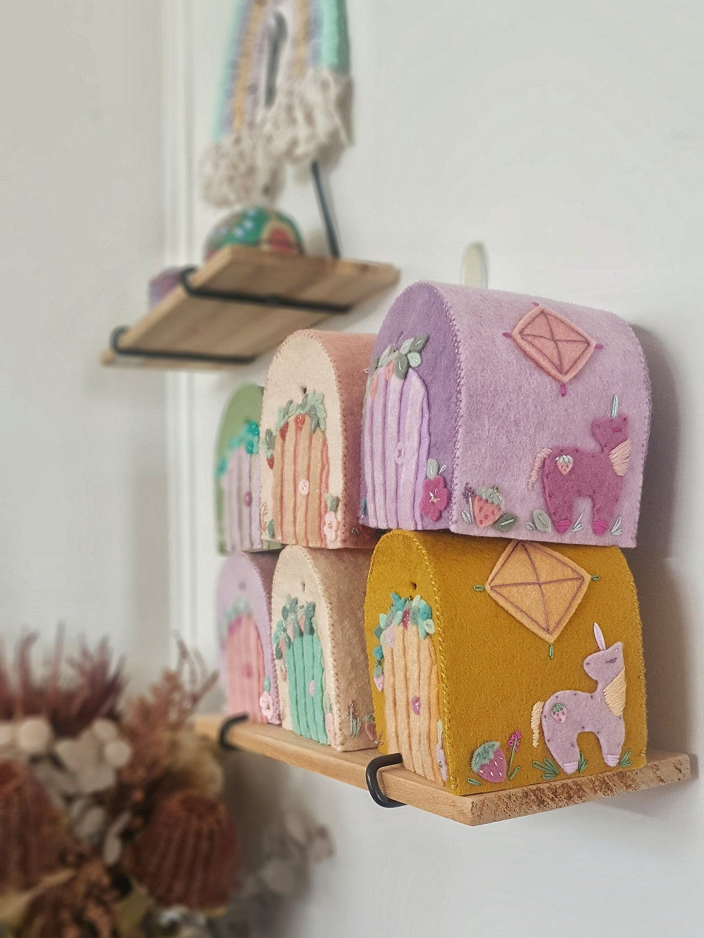 The front of each cottage is detailed with an adorable applique door, strawberries & wildflowers. The remaining walls are decorated with an enchanted Unicorn, florals, berries, decorative windows & celestial symbols. All finished off with embroidery & pretty beading.
