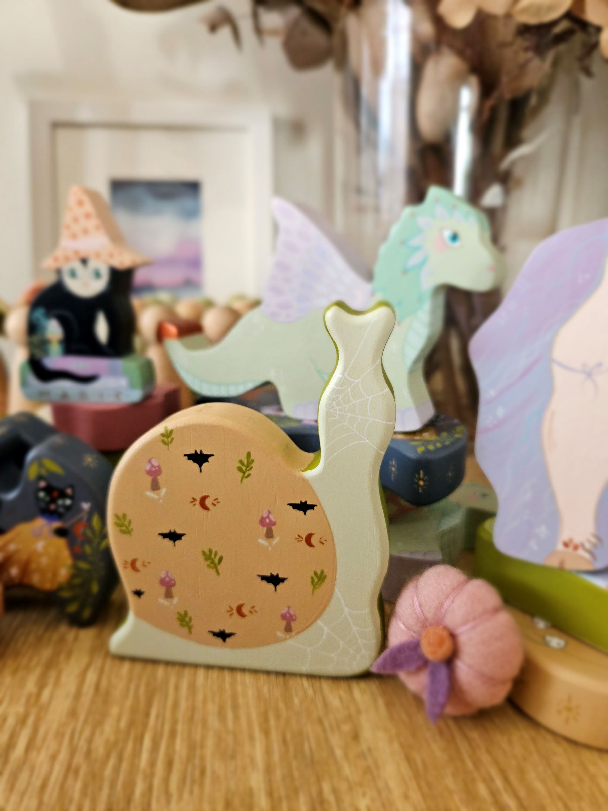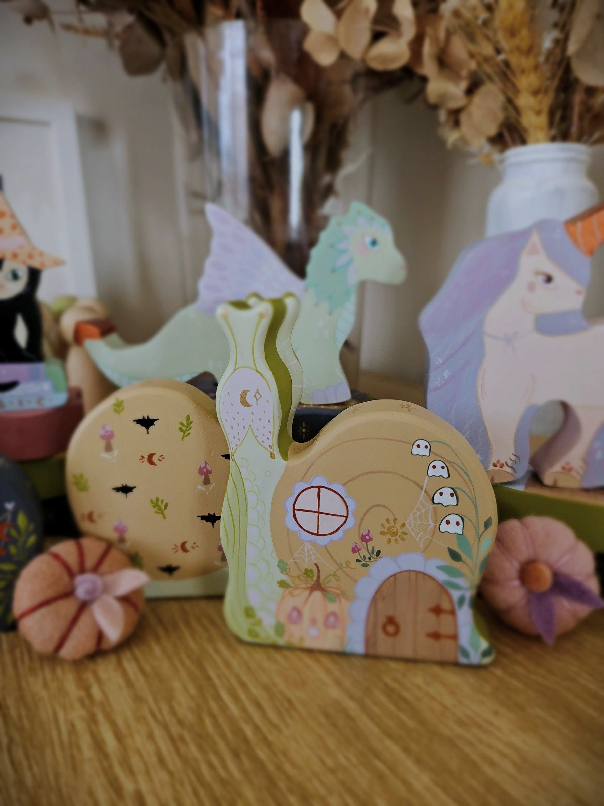 Our handcrafted whimsical wooden snail is an excellent addition to your child's nature play, storytelling and seasonal table. Bringing a sense of magic and joy to any small world play space.